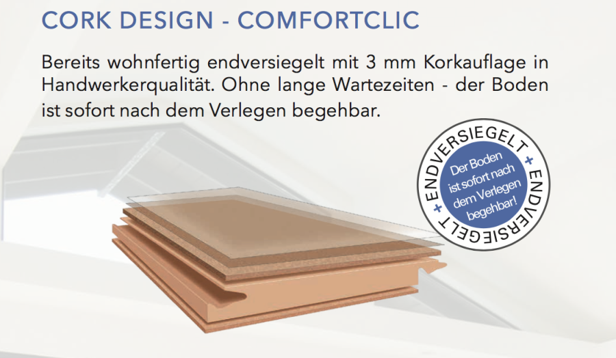 Bereits wohnfertig endversiegelt mit 3 mm Korkauflage in Handwerkerqualität. Ohne lange Wartezeiten - der Boden ist sofort nach dem Verlegen begehbar.